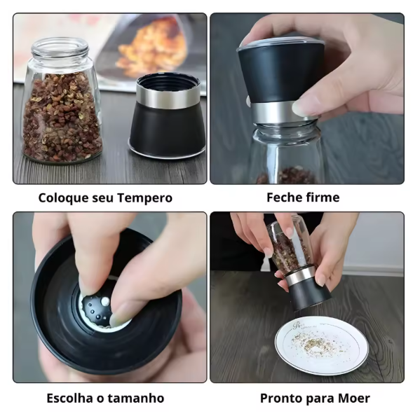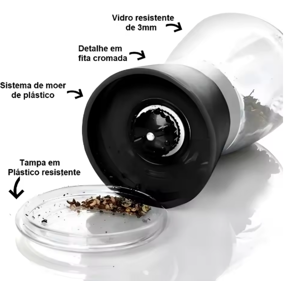 Versátil: Indicado para sal grosso, pimenta, sementes e especiarias diversas.