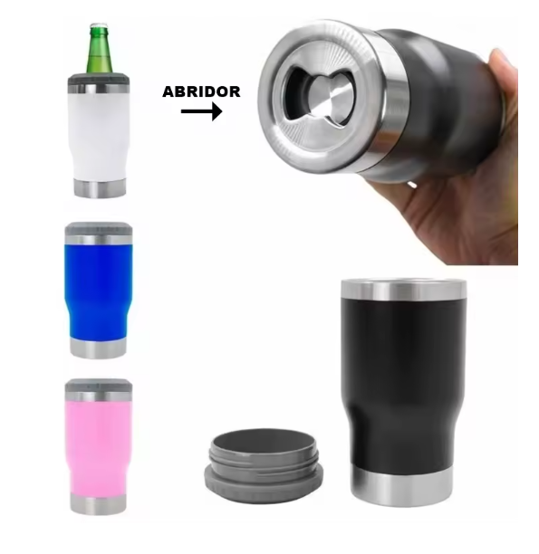 Projetado para se adaptar a qualquer tipo de bebida, ele é compatível com long necks, latas padrão, latas altas, barrigudinhas e uso direto como copo térmico.
